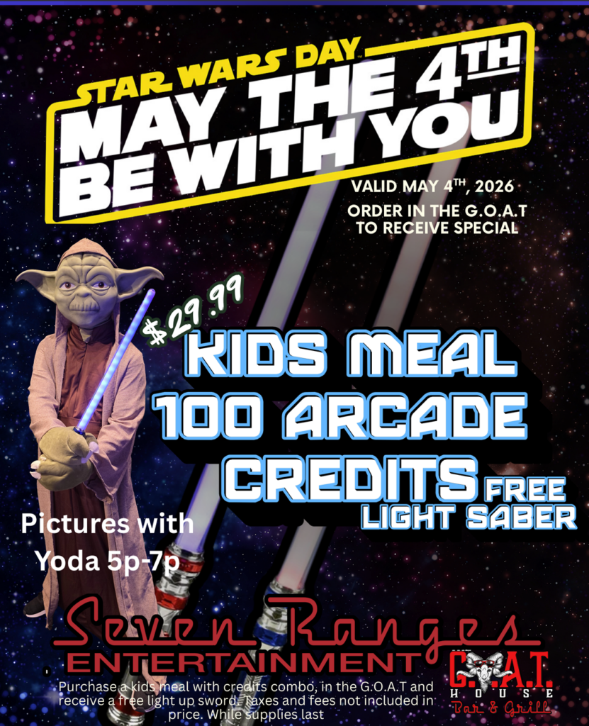 On May 4th, 7 Ranges Entertainment celebrates Star Wars Day! Enjoy a kids meal, 100 arcade credits, plus receive a free lightsaber, all for only $29.99. In addition, a special guest will be roaming around for a photo opportunity from 5 – 7 PM. May the 4th be with you!