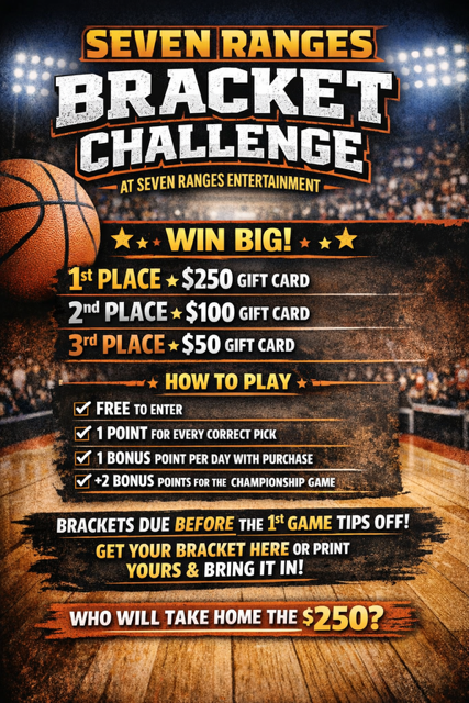 Beginning on Sunday, March 15, 2026, after the NCAA Basketball tournament teams are announced, stop in and fill out or drop a completed 2026 NCAA Basketball tournament bracket for a chance to win! FREE to Enter Win Big! 1st Place will receive a $250 7 Ranges/The G.O.A.T House gift card. 2nd Place will receive a […]